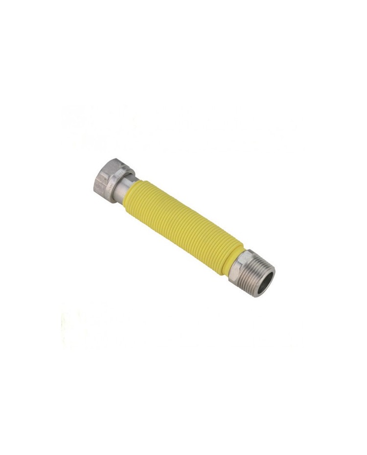 Tubo flessibile in acciaio Inox AISI 316L estensibile per allacciamento Gas con rivestimento guaina di colore giallo termorestringente. Pressione max 10bar, Temperatura d'eseercizio max 100°C. A Norma UNI 11353.