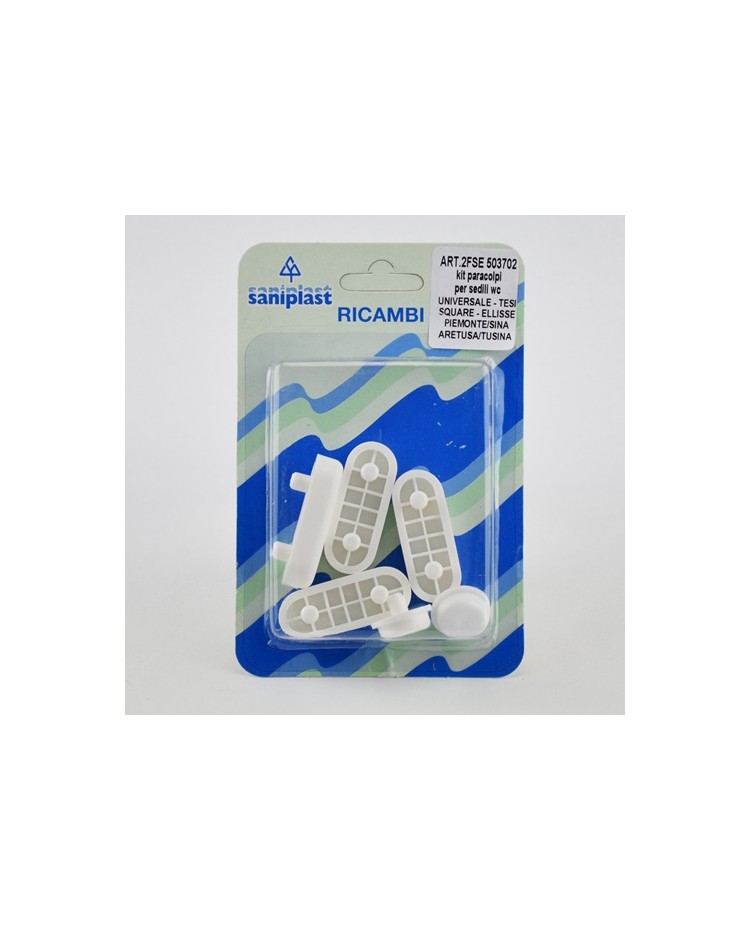 Set paracolpi per sedili wc in legno poliestere e mdf. Colore bianco, materiale termoplastico; il set composto da 4 paracolpi e 2 funghetti è ideale per i modelli di sedili wc con forma universale. 100% made in Italy.