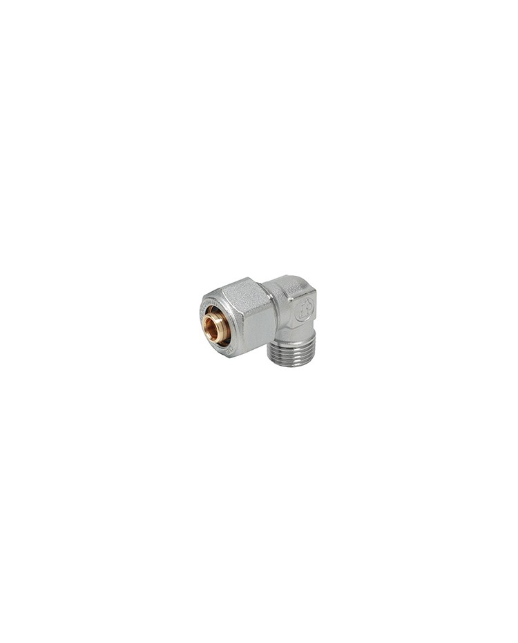 Raccordo curvo 90°, filettato maschio, con adattatore per tubi in plastica o multistrato. In ottone UNI EN 12165 CW617N cromato. O-ring nero di tenuta in EPDM, conforme norma EN 681.1. Per impianti idraulici e sanitari. Campo di temperatura 5÷110 °C. Pressione massima di esercizio 10 bar.