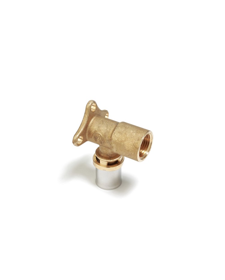 Raccordo curvo 90° a pressare multipinza, con filetto femmina e staffa per installazione a muro.
