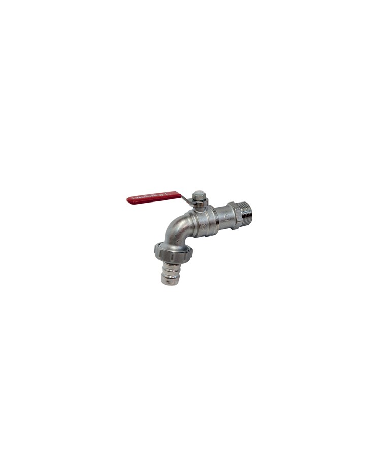 Rubinetto da giardino, a sfera, con attacchi filettati maschio-portagomma. In ottone UNI EN 12165 CW617N cromato. Passaggio standard. Maniglia a leva in acciaio con trattamento anticorrosione e rivestimento in PVC di colore rosso. Asta di comando con doppio O-Ring di tenuta. Dado con rivestimento anticorrosione, sigillo di garanzia ed ologramma. Temperatura minima di esercizio: 5 °C. Temperatura massima di esercizio: 90 °C. Pressione massima di esercizio a 20 °C con acqua: 1,0 MPa (10 bar).