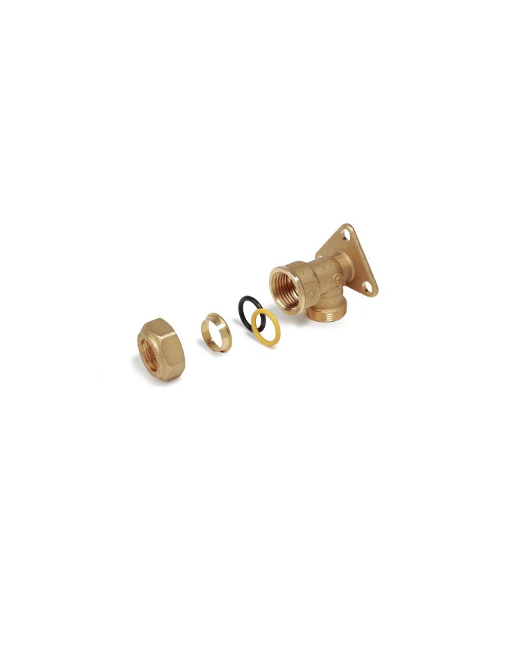 Raccordo a gomito, filettato femmina, con staffa a muro, per tubo rame. In ottone